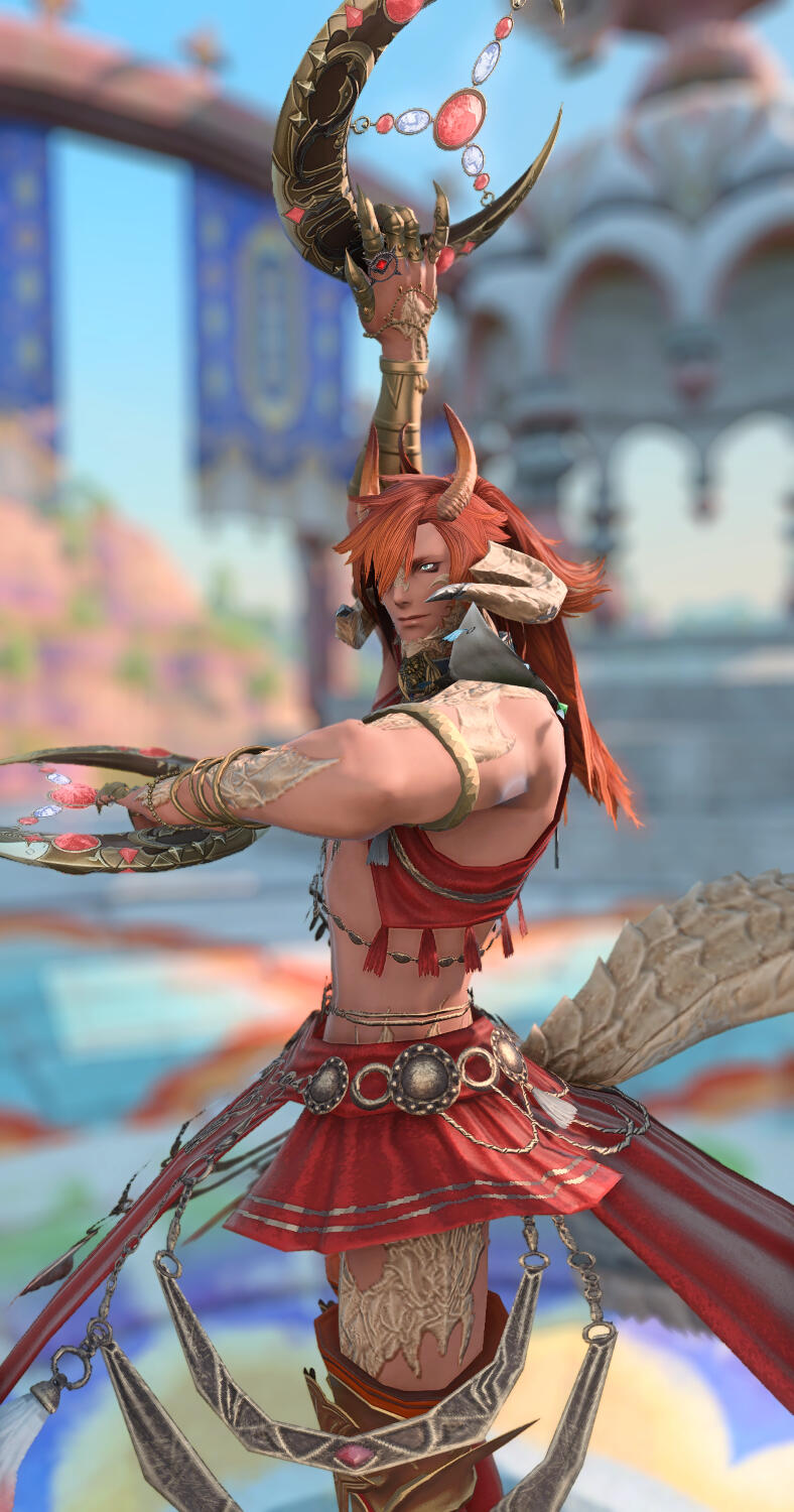 Basil is a nomadic and gregarious soul, hungry for adventure and sights while yearning to learn the stories of those that cross his path. He struggles to linger in one place for long, being one so flight of foot and fancy.He is the first of four sons between a Thavnarian Raen merchant and an Ishgardian Elezen noblewoman, born and raised in Ul'Dah. Basil was initially trained in arcanism, dabbling in various other jobs throughout his journey before finally discovering his passion for kriegstanz. Basil's love for performance is only overshadowed by his lust for battle and he easily fell into the rhythm of being the Star's hero.Since being relieved of his duties as Warrior of Light, Basil can be typically found traveling with his partner Z by his side. Lately he has been spotted sunbathing in various locations in Old Sharlayan or helping with restoration efforts across the major city-states, hoping to revitalize the morale of those affected by the Final Days through his performances.